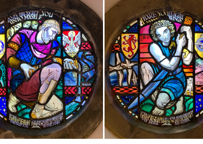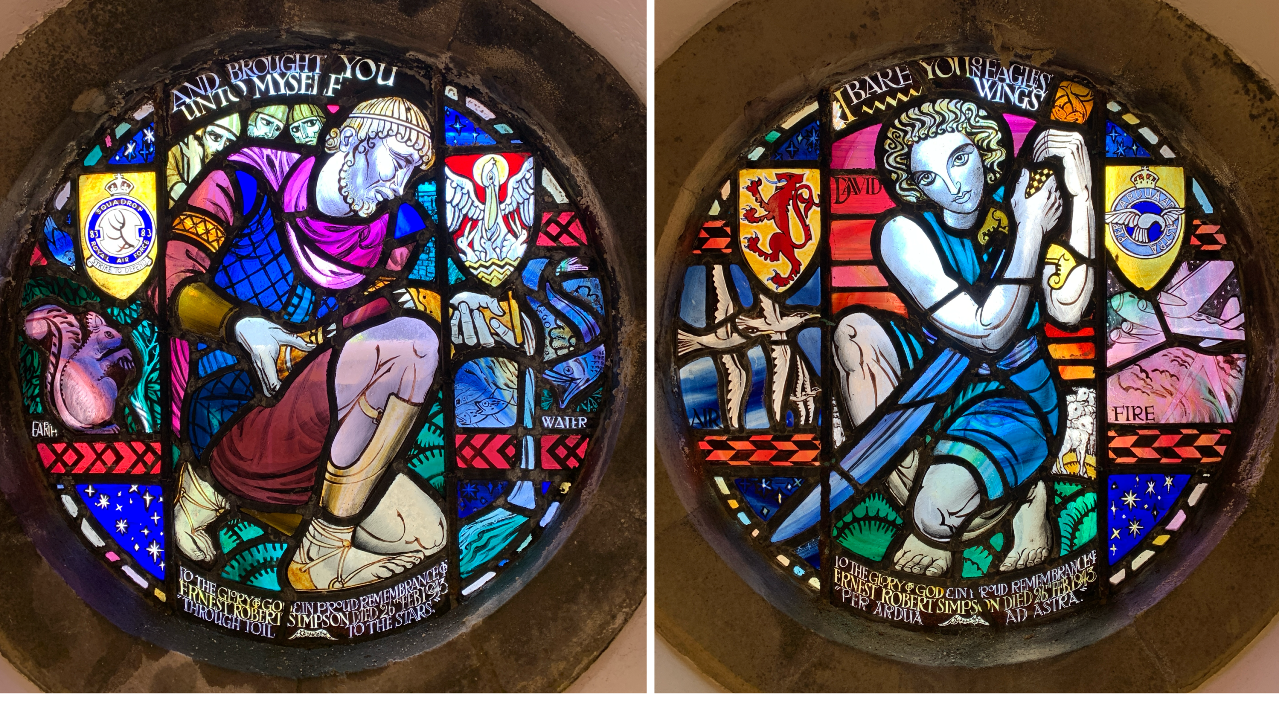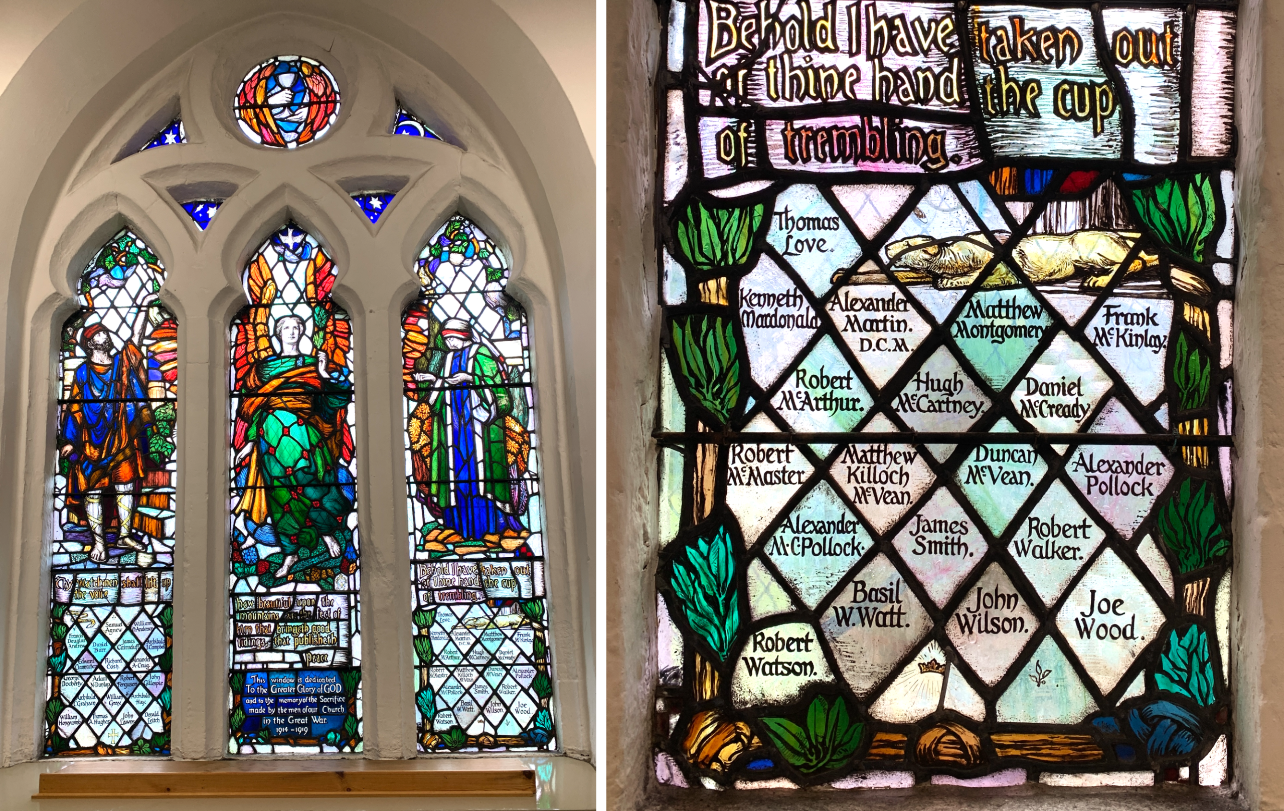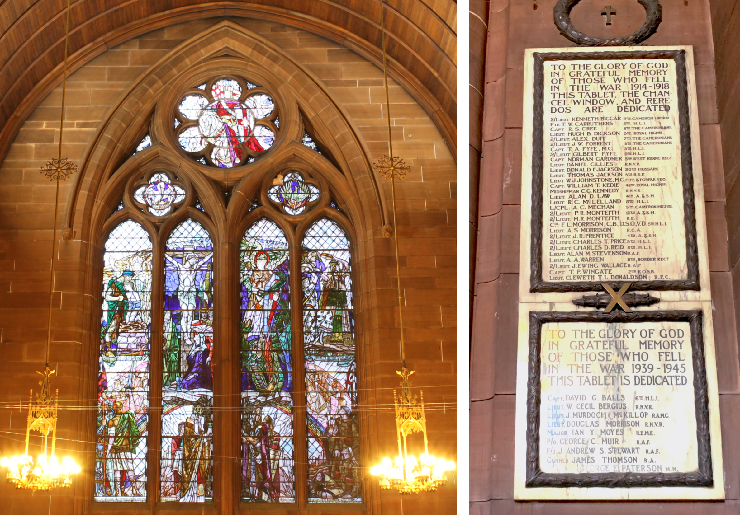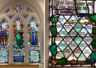There are also many donated windows with the name of an individual soldier included in the design (eg the lovely Douglas Hamilton paired circular windows in St John’s Largs).