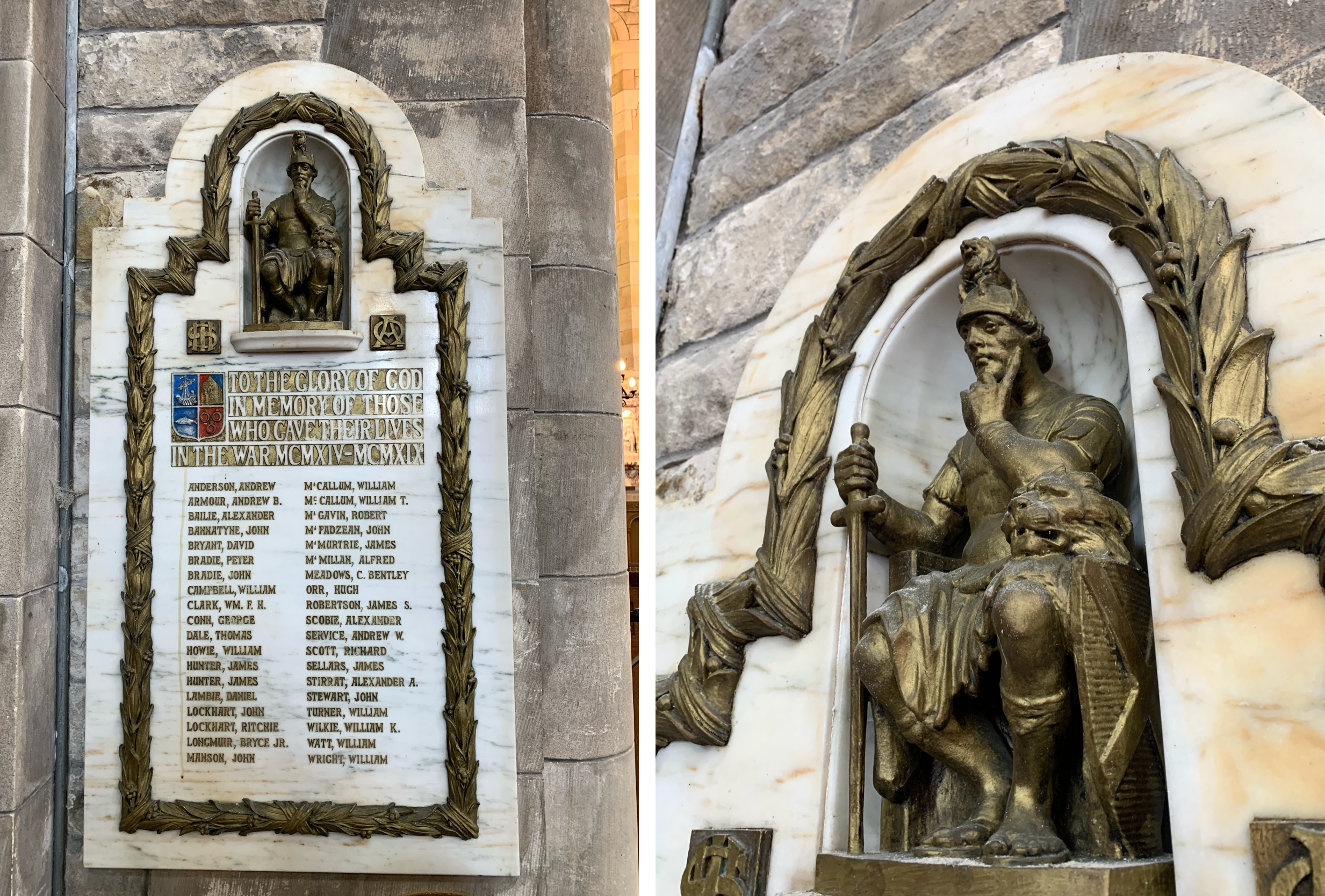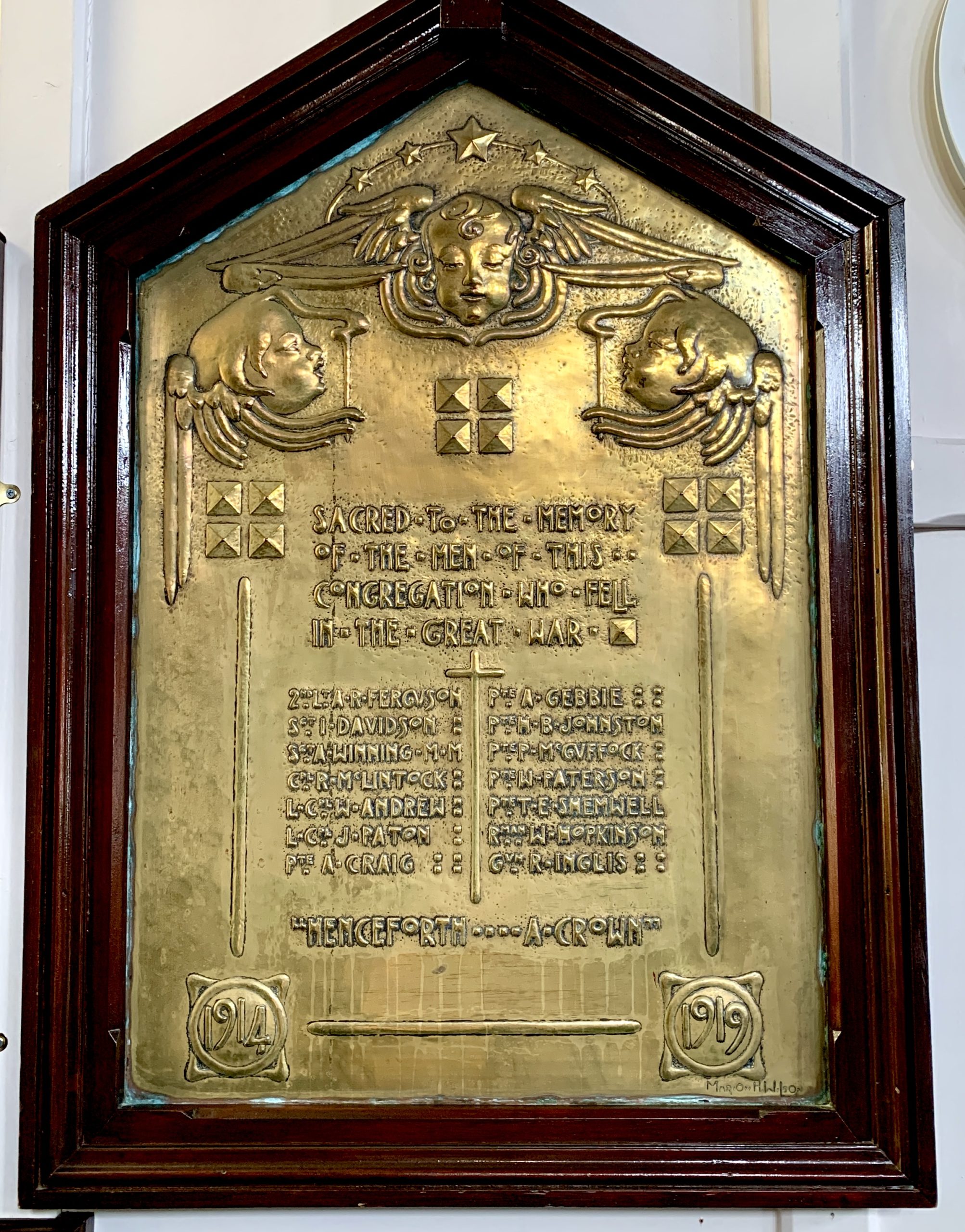 Many of the memorials are works of art in themselves, particularly those with bronze castings (good examples being the memorials in St Cuthbert’s, Saltcoats, and Finnart Church, Greenock); there is a repoussé brass panel at Neilston by Marion Henderson Wilson, one of the eminent ‘Glasgow Girls’. There is much fine carved woodwork, notably the reredos figures of saints at Finnart St Paul’s Greenock and Hyndland Parish Church Glasgow, and in simpler panels such as at Cathcart Old, Glasgow; St John’s, Largs, has a ‘triptych’ type memorial made with wood from HMS Britannia