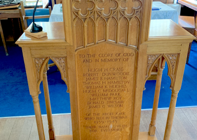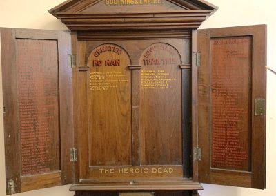 War Memorials with a full listing of the names of the dead take a wide variety of physical forms – most often simple flat bronze or brass plaques: but also for example paper/parchment Rolls of Honour (at particular risk of being rolled up and left behind in cupboards); cast or repoussé metal reliefs; carved marble plaques and furnishings such as baptismal fonts; fixed and moveable carved wooden furnishings (eg wall-mounted reredos panels, pulpits and lecterns); stained glass; and wrought iron items such as gates and screens.