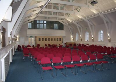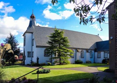 Rosyth Parish Church stands at the heart of Rosyth, built as a Garden City when the Royal Naval Dockyard was developed in the early 1900s. The church was designed in 1930 by Hugh Mottram a pupil of Raymond Unwin the developer of the Garden City concept. The building is reminiscent of Dutch Architecture, with its square tower and steeple finished with a teak belfry, and copper roof crowned by a cross. The nave, 80ft by 40 ft wide is spanned by an open timber roof with a wide arch at the west end which leads to the apse. The later Church Hall extension of 1954 was also designed by Mottram as were some of the houses in the Garden City. The 1968 extension is by D White & Associates. The church has recently undergone a large renovation.