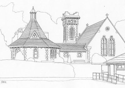 Unusual Gothic polychrome granite and whinstone church, designed by London architect, Edward Buckton Lamb. Its foundation stone was laid by the Bishop of Glasgow and Galloway in 1856 and it was completed by 1861. Its tower originally had a spire that was removed in 1950 due to a woodworm infestation . Inside, the pointed chancel arch is the main feature. Stained glass by Taylor in the nave and Ballantyne in the east window.