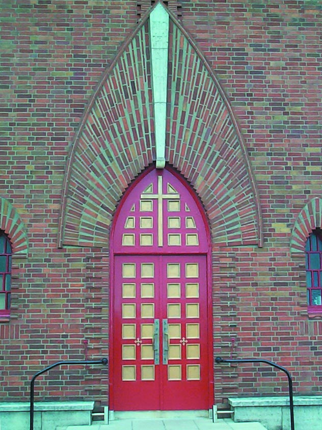 Built in reddish brick, the church has a high west gable and a striking tower that’s reminiscent of Stockholm Town Hall. It was described by critics at the time as being “built in the modern Swedish manner” and as “an essay in the Swedish style”. It possesses a magnificent main arched doorway, mostly made of brick but with a carved stone keystone and interesting repeating pattern of bricks extending up to the gable roof where it terminates in a small, well-detailed cross. The entrance porch has small windows and contains holy water stoups in recesses as well as a granite font.