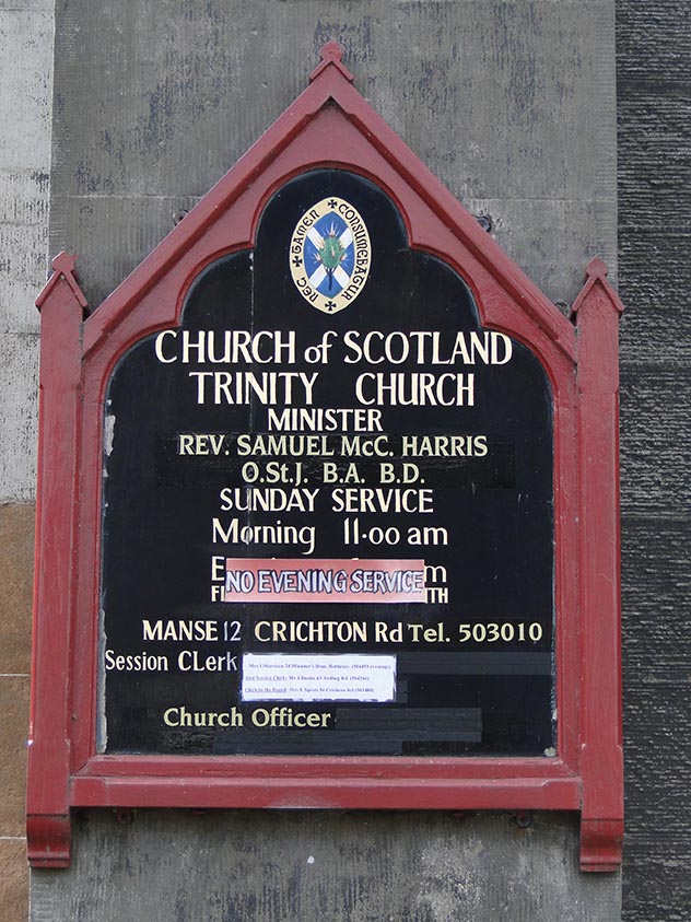 The information about churches in Scotland’s Churches Scheme has been provided by the congregations or taken from the Historic Scotland list and published sources, in particular, the Buildings of Scotland volumes and the RIAS Illustrated Architectural Guides. To contact this specific church please complete the Contact this Church form above. The information is not authoritative; please contact Scotland’s Churches Trust to let us know of any errors or omissions.